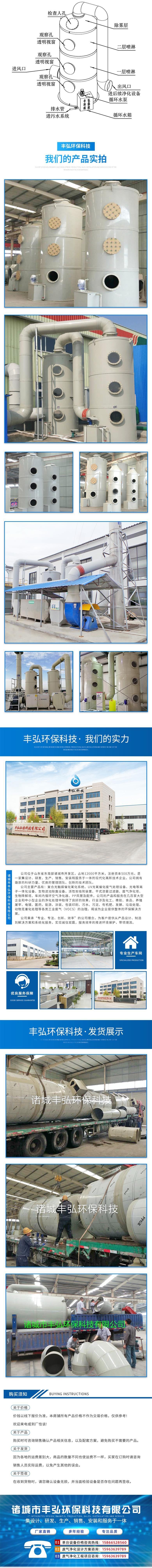 廢氣處理塔分單塔體和雙塔體。采用圓形塔體,用法蘭分段連接而成。具體由貯液箱、塔體、進(jìn)風(fēng)段、噴淋層、填料層、旋流除霧層、出風(fēng)錐帽、觀檢孔等組成。